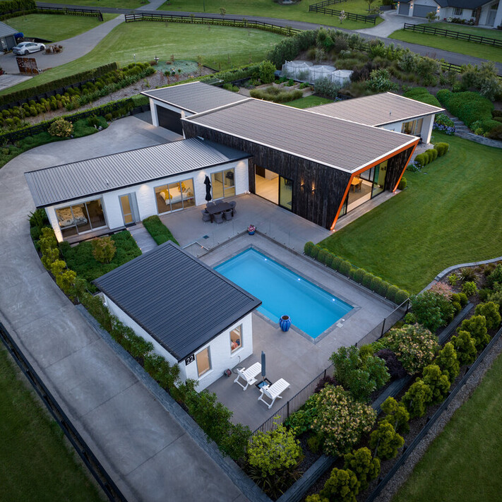 Designed to be viewed from above the house references an abandoned Airfield, the Airfield some km away was created in the Second World War to hide Airforce Planes, it had underground bunkers on the edge of the Manukau Harbour where Aeroplanes could be hidden away. The sharp lines of the scorched larch box (containing the living spaces) intersects and contrasts with the “white wings and tail of the aeroplane” containing the bedroom and garaging and utility spaces of the house.